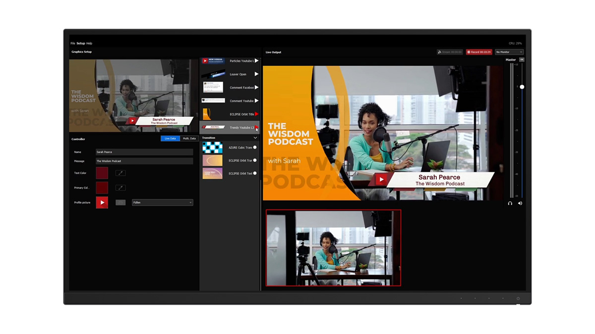 Engage your live audience on all the popular platforms. Upgrade your stream with multiple cameras, video play-ins, and dynamic graphics.